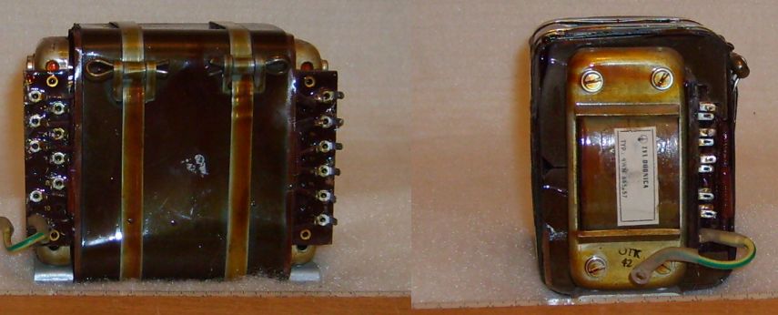 Transformátor ze zdrojů terminálu SM 7202 vyráběného TESLOU Orava. Transformátor je velmi pěkně provedený, sice má poněkud složitější primár (viz výkres), ale sekundár je již poměrně jednoduchý. Transformátor je stíněný v permaloyovém plechu.