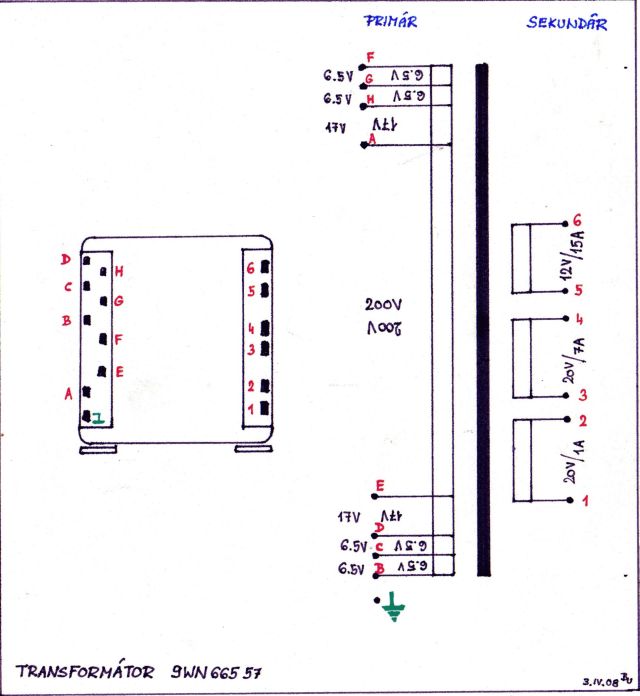 Poznámka: Hodnoty napětí na primárním vinutí jsou o něco nižší než uvádím. Na obrázek se dostaly omylem hodnoty měřené naprázdno. Každopádně 240V se připojuje mezi vývody B a F.